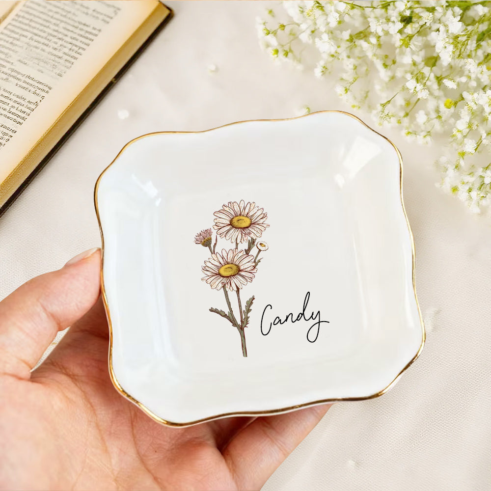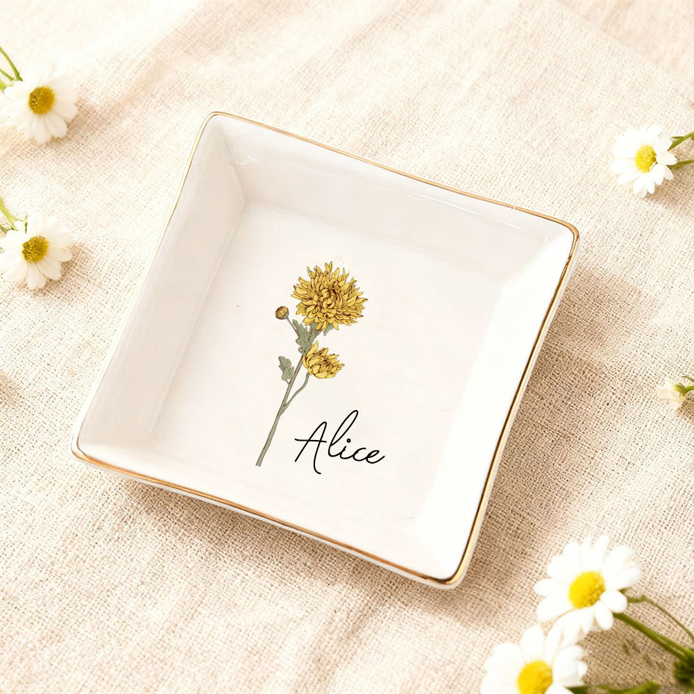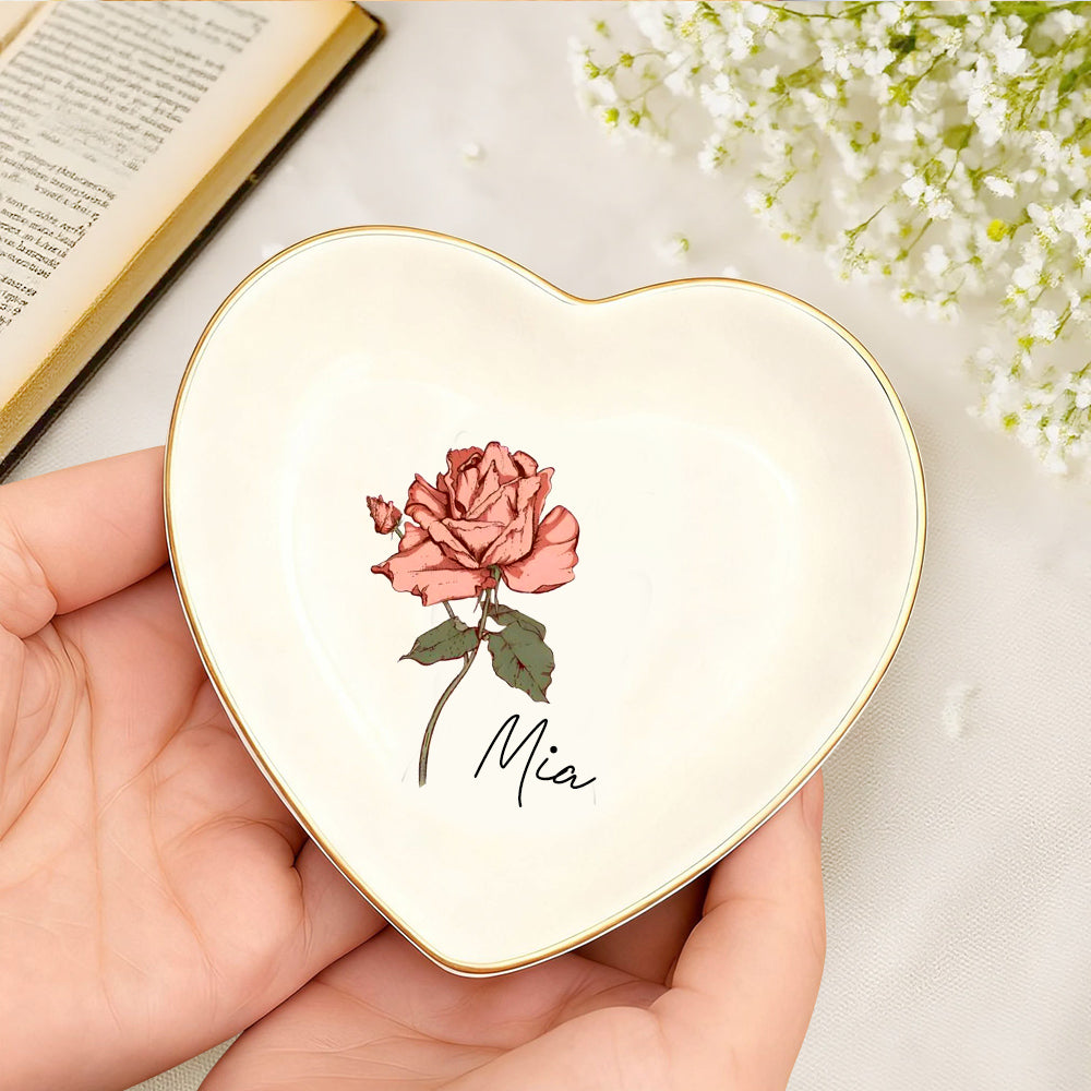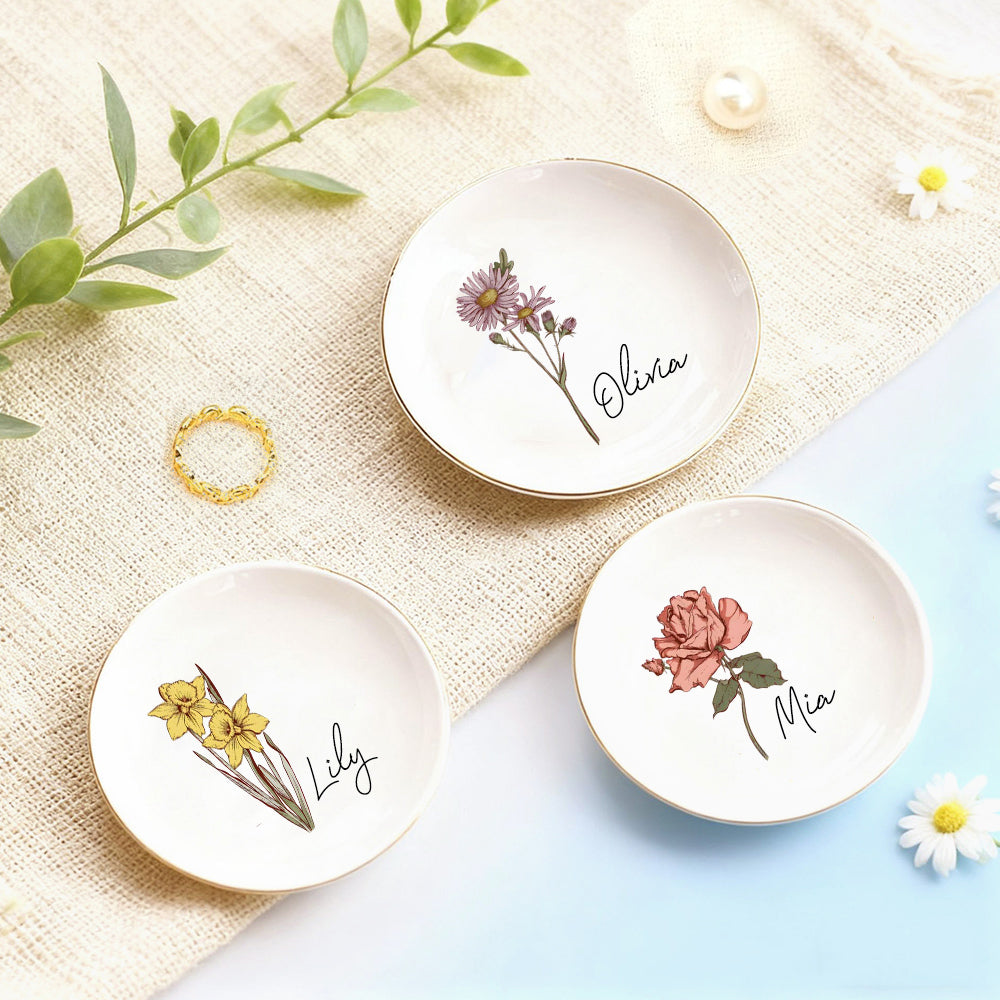 Personalized Birth Flower Ceramic Ring Dish For Her Custom Jewelry Dish with Name Wedding Day Gift Valentine's Day Gift