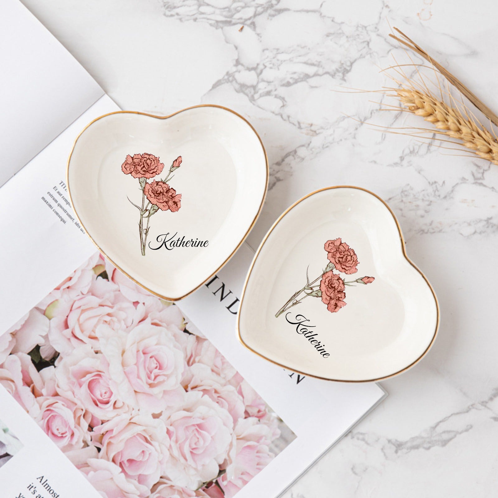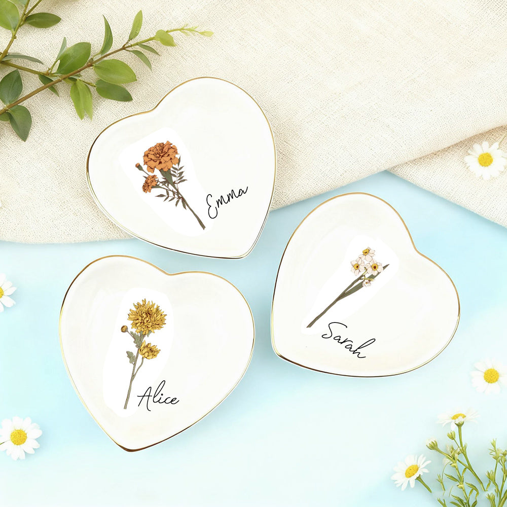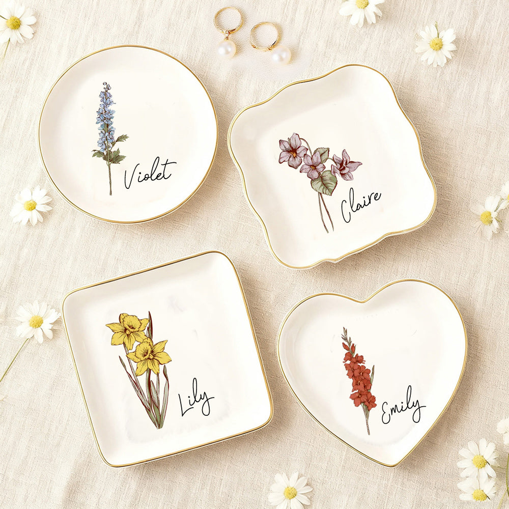 Personalized Birth Flower Ceramic Ring Dish For Her Custom Jewelry Dish with Name Wedding Day Gift Valentine's Day Gift